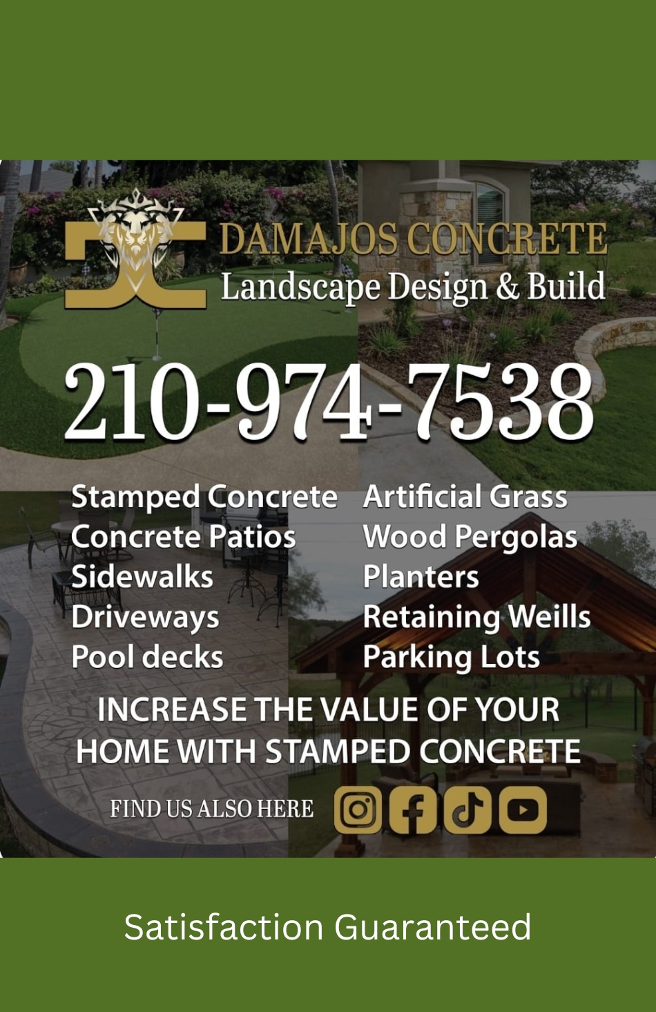 Damajos Concrete Contractors specializes in high-quality concrete work, pergolas, decks, and turf installations. With expertise in residential and commercial projects, we deliver durable foundations, driveways, patios, and walkways tailored to your needs. Our custom pergolas and decks add style and functionality to any outdoor space, while our premium turf solutions provide a lush, low-maintenance landscape. At Damajos Concrete Contractors, we combine craftsmanship with top-grade materials to ensure lasting results. Contact us today for a free estimate!