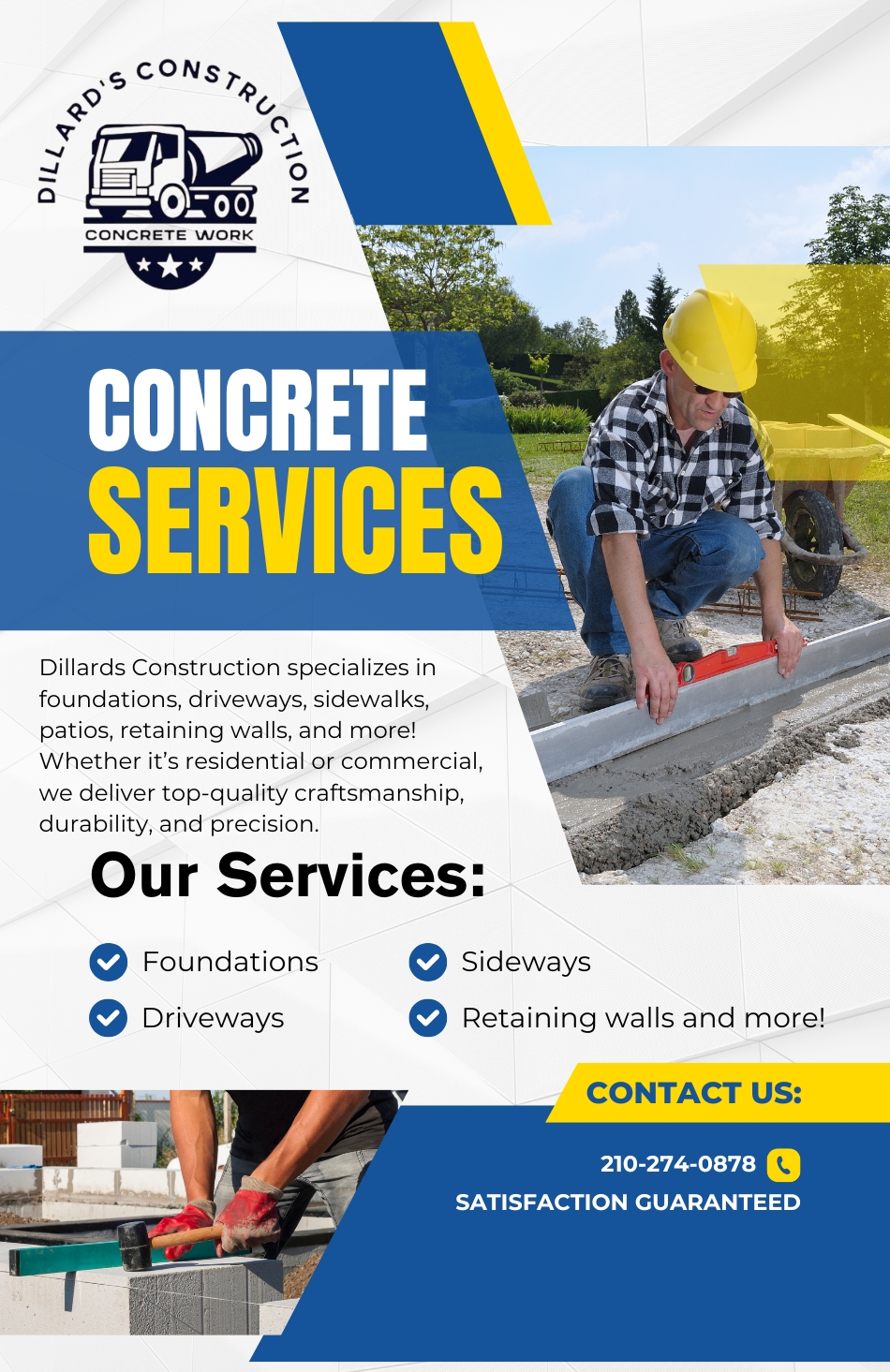 Dillards Construction is a trusted name in the concrete industry, specializing in high-quality residential and commercial concrete services. With years of experience, we deliver durable and expertly crafted foundations, driveways, sidewalks, patios, retaining walls, and more. Whether you're looking for new construction, repairs, or decorative concrete solutions, our skilled team is committed to precision, reliability, and customer satisfaction. At Dillards Construction, we build with strength and integrity to ensure lasting results for every project. Contact us today for a free estimate!