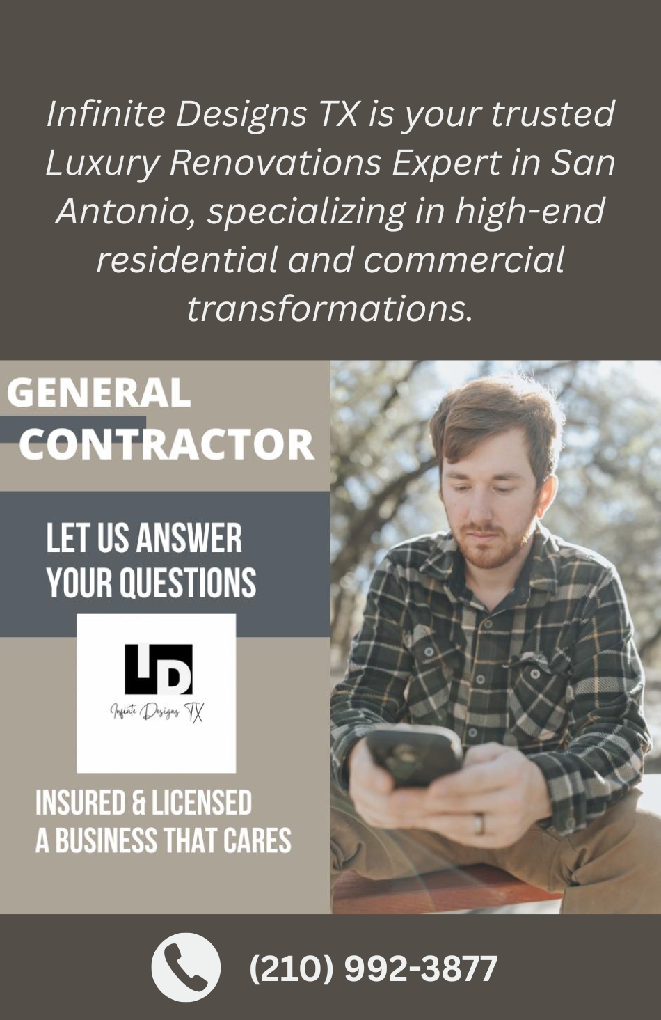 Infinite Designs TX is your trusted Luxury Renovations Expert in San Antonio, specializing in high-end residential and commercial transformations. As a family-owned and operated business, we take pride in delivering exceptional craftsmanship, personalized service, and attention to detail in every project. Whether you're looking to upgrade your home, modernize your office, or completely remodel your space, we bring expertise, innovation, and quality materials to bring your vision to life. Fully licensed and insured, we ensure professionalism and reliability from start to finish. Elevate your space with Infinite Designs TX—where luxury meets precision!