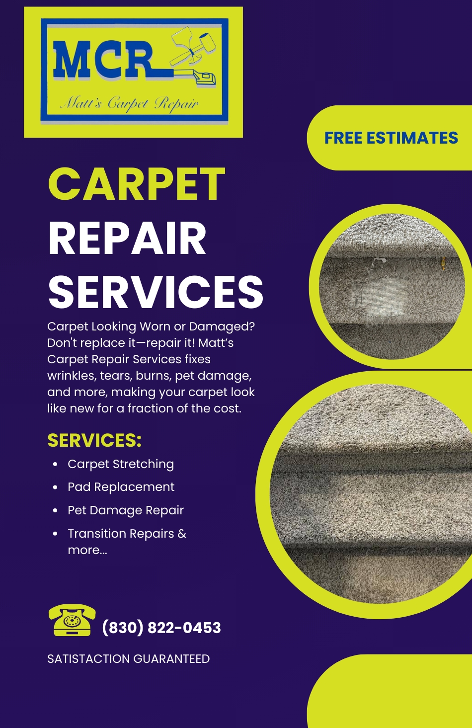 Matt’s Carpet Repair Services specializes in high-quality carpet repair and restoration, bringing your flooring back to life without the need for costly replacements. Whether you're dealing with wrinkles, burns, pet damage, loose seams, or stubborn stains, Matt’s expert team has the skills and tools to make your carpet look as good as new. With a commitment to precision and customer satisfaction, Matt’s Carpet Repair Services ensures seamless repairs, extending the life of your carpet while saving you money. Contact us today for a free estimate and experience top-notch craftsmanship with every repair!