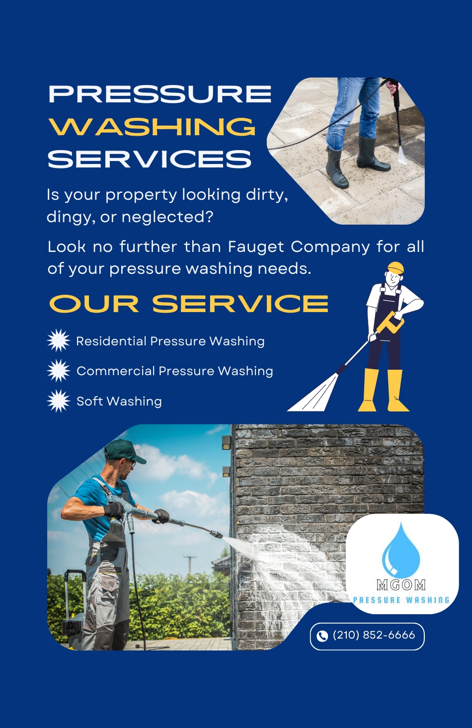 MGOM Pressure Washing is your go-to expert for top-quality exterior cleaning services. Specializing in residential and commercial pressure washing, we remove dirt, grime, mold, and stains from driveways, sidewalks, patios, fences, roofs, and building exteriors. Our professional team uses high-powered equipment and eco-friendly solutions to restore surfaces to their original beauty, enhancing curb appeal and property value. Whether you need a one-time deep clean or regular maintenance, MGOM Pressure Washing delivers exceptional results with reliability and attention to detail. Contact us today for a free estimate and experience the difference!